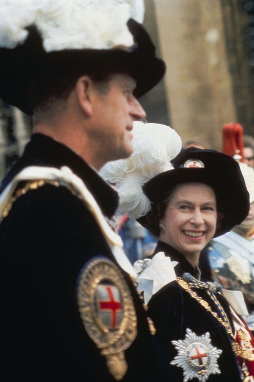 Nữ hoàng Elizabeth mỉm cười với chồng mình, trong một buổi lễ tại Lâu đài Windsor vào năm 1957.